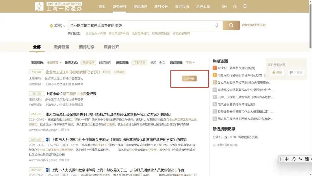 通过“上海一网通办”平台,以企业身份通过“法人一证通”或者“电子营业执照”登录后直接在搜索界面搜索“企业职工退工和停止缴费登记”,点击对应功能后的立即办理,便可到达“企业职工退工和停止缴费登记”页面。